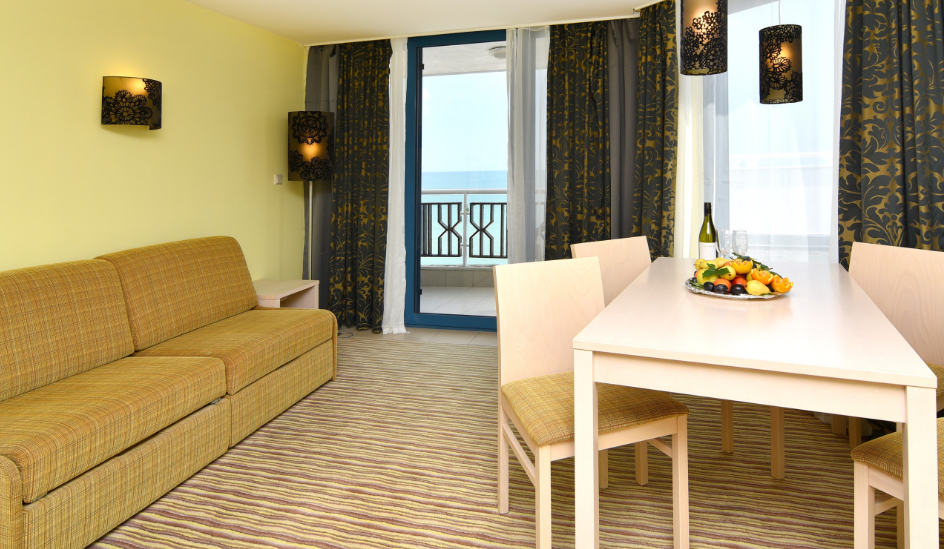 • вітальня з розкладним диваном та однією або двома окремими спальнями, кожна з яких має двоспальне ліжко