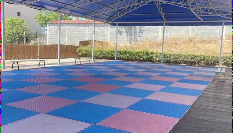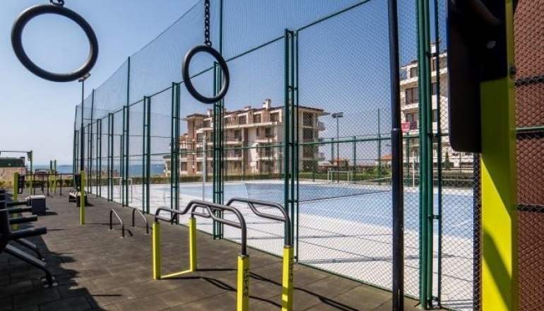 Обладнання: ворота 3 х 2 м, щити баскетбольні 180 х 105 см, діаметр кільця 45 см, тенісна сітка з тенісною розміткою